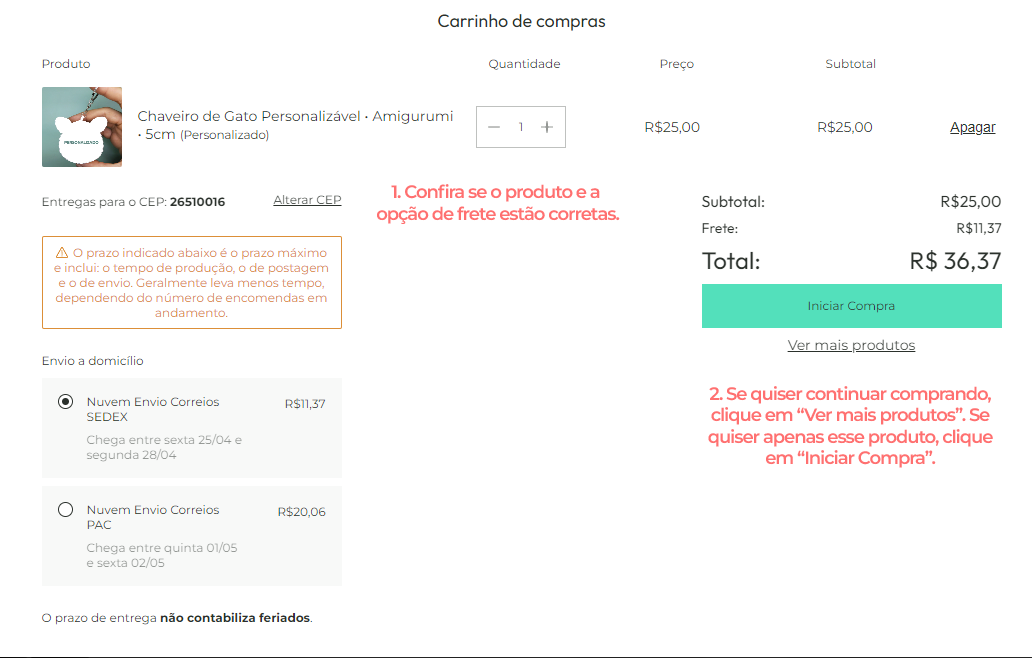 4. Confira se o produto e o CEP estão corretos, e prossiga clicando em "Iniciar compra".