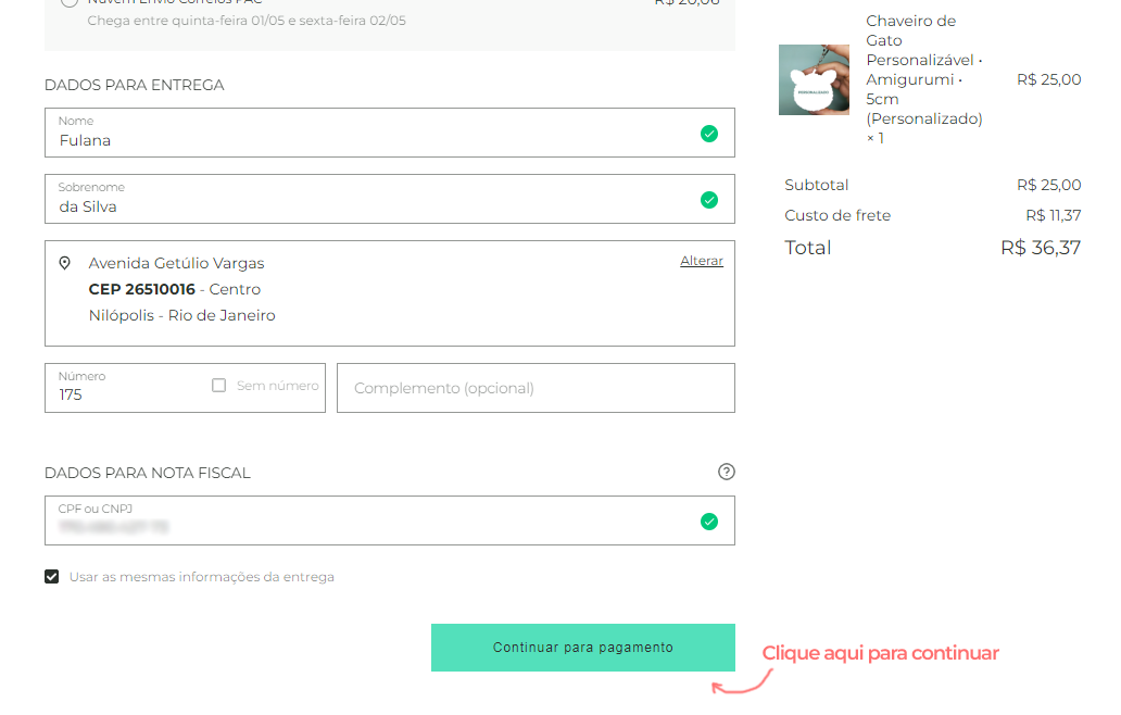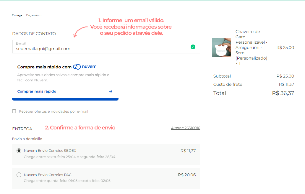 5. Nesta página, você precisará informar o seu email, confirmar a forma de envio, e preencher os dados de entrega com o seu nome completo, endereço e CPF. Importante: informe um email válido, pois você receberá informações sobre o seu pedido (como o dia da postagem e o código de rastreamento) através dele.