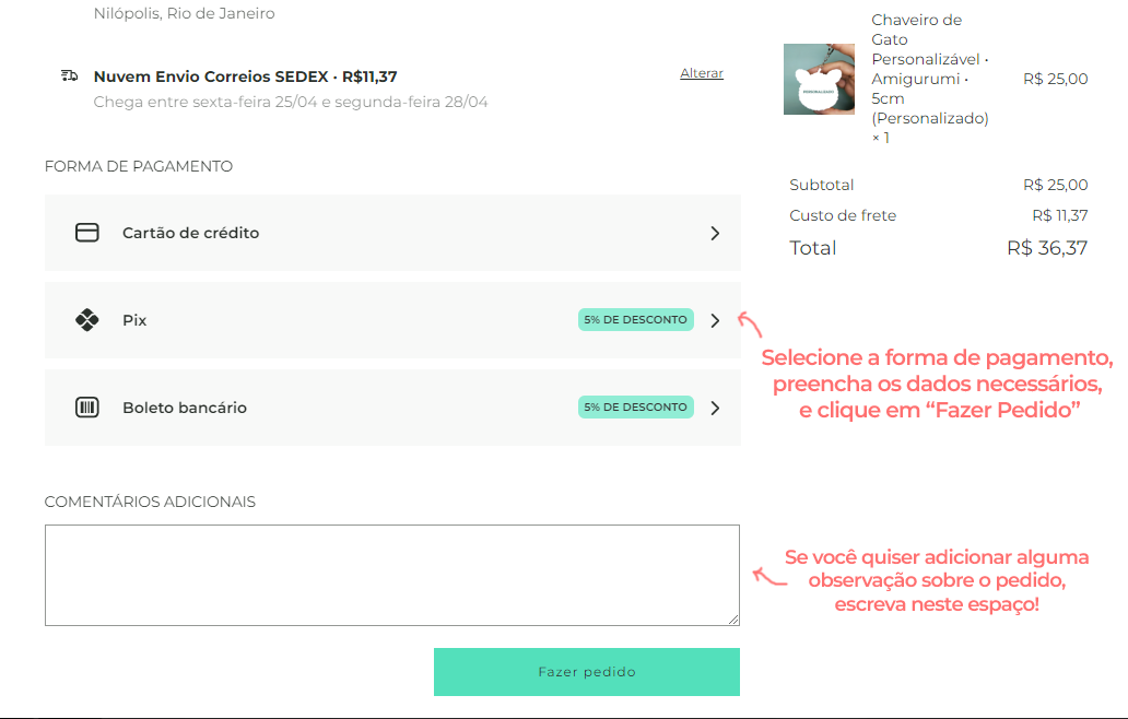 6. Selecione a forma de pagamento e preencha os dados necessários. Por fim, clique em Fazer Pedido!